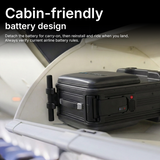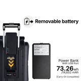 The removable 73.26Wh power bank with USB output keeps your devices charged on the go. Carry-on compatible and built for modern travel.